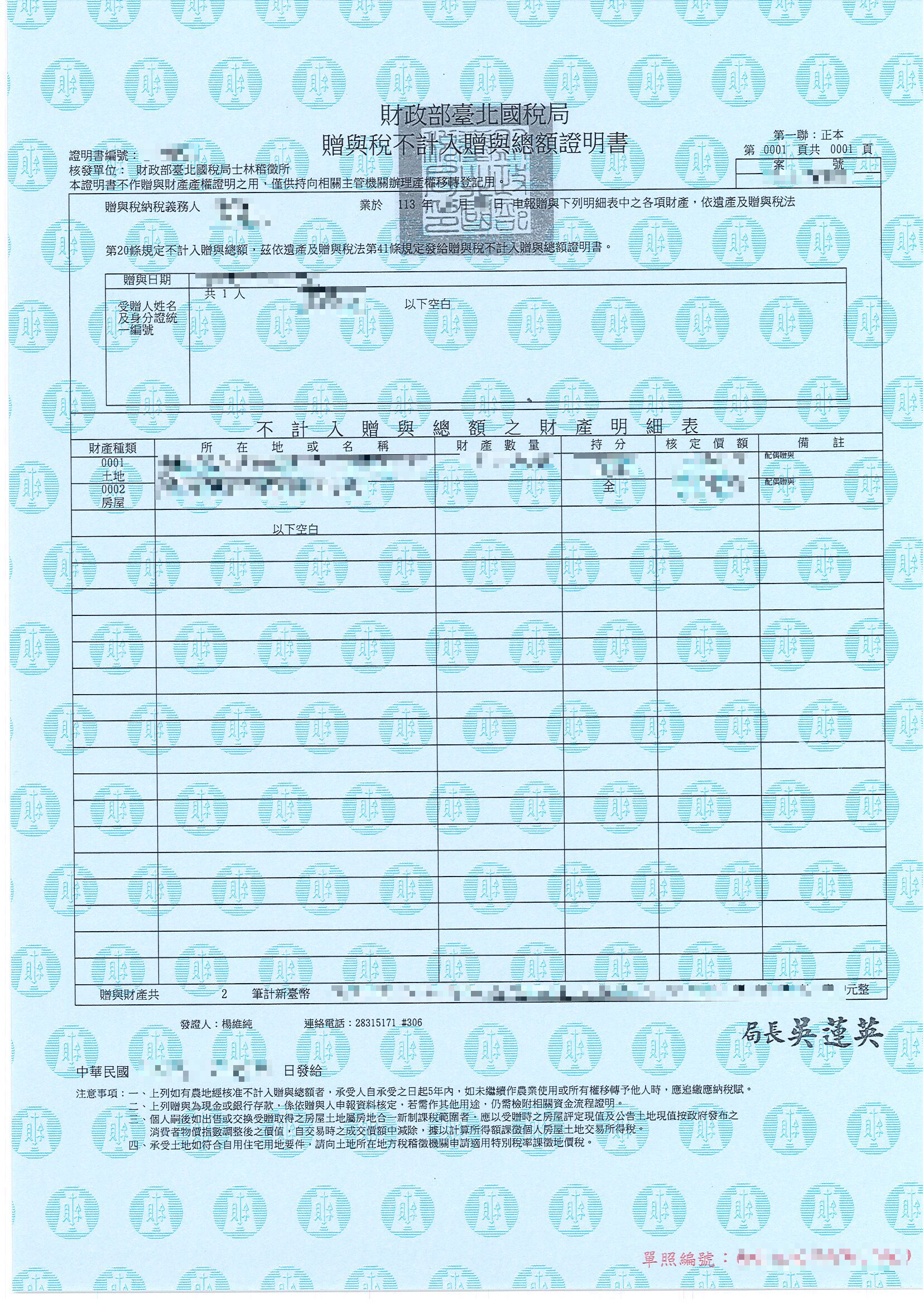 ►範例:贈與稅不計入贈與總額證明書